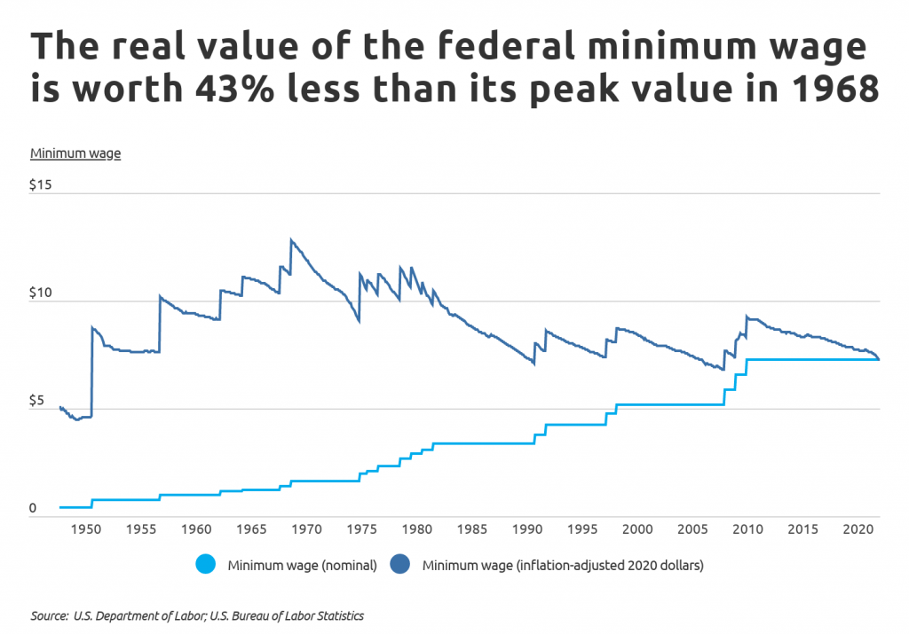 The result of requiring Congress to act to raise the federal minimum wage is that the real value of the wage has fluctuated over time. At its peak in 1968, the minimum wage was worth $12.77 in 2020 dollars. When the last minimum wage increase took effect in 2009, the wage was worth $9.22 per hour in 2020 dollars. This means that the real value of the current $7.25 wage is down 43% from its historical peak, down 21% since the last increase, and at one of its lowest-ever levels in recent history.