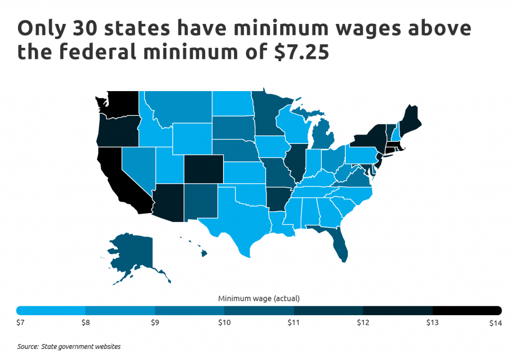 In some of the 20 states that have not raised the minimum wage, cost of living is low, so the federal minimum wage does not create as much pressure on household finances. In others, however, the real value of the minimum wage relative to cost of living is much lower, and low-wage workers may have a harder time getting by.