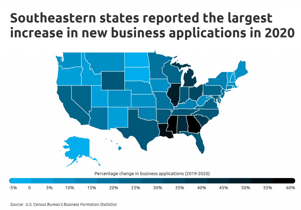 - Percentage change in business applications (2019-2020): +56.8%
