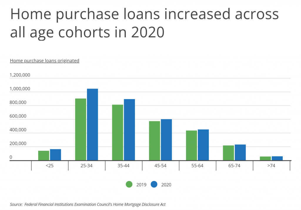 Data on home loans from the Home Mortgage Disclosure Act also confirms young adults’ increasing levels of homeownership. Of all age groups, adults under 25 saw the largest percentage increase in the number of home loans originated between 2019 and 2020, increasing by 16.9%. However, the same data also points to the competition that young buyers may face: the number of home purchase loans originated increased in every cohort from 2019 to 2020, and adults under 25 were the second-smallest age cohort, representing only about 160,000 loans out of 3.4 million total.